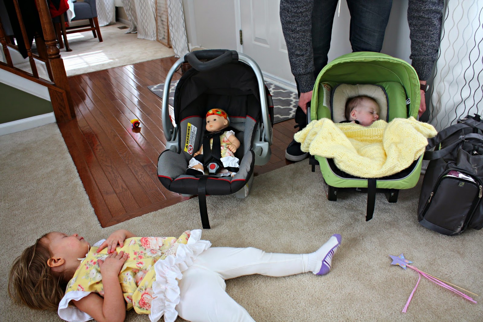 | Lorelei really thought Bitty needed a car seat like Addison and Alexandra, so we brought up an old one. Who knew it would be so fun? |